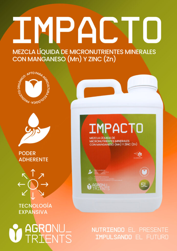 Impacto es un corrector de carencias de zinc y manganeso de alta eficiencia, diseñado para maximizar la optimización y cobertura de las aplicaciones foliares. Su exclusiva tecnología expansiva y gran poder adherente actúan modificando la tensión superficial del agua, asegurando un reparto uniforme sobre la superficie vegetal y una asimilación nutricional superior.