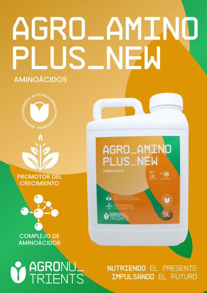 Agro Aminoplus New es un bioestimulante natural de alta eficacia diseñado como promotor del crecimiento, formulado con un alto porcentaje de aminoácidos libres de rápida asimilación. Su composición, derivada de la hidrólisis controlada de sustancias proteicas, optimiza el estado fisiológico del cultivo durante las fases más críticas, como la prefloración y post-floración, asegurando un desarrollo equilibrado y vigoroso durante todo el ciclo vegetativo.