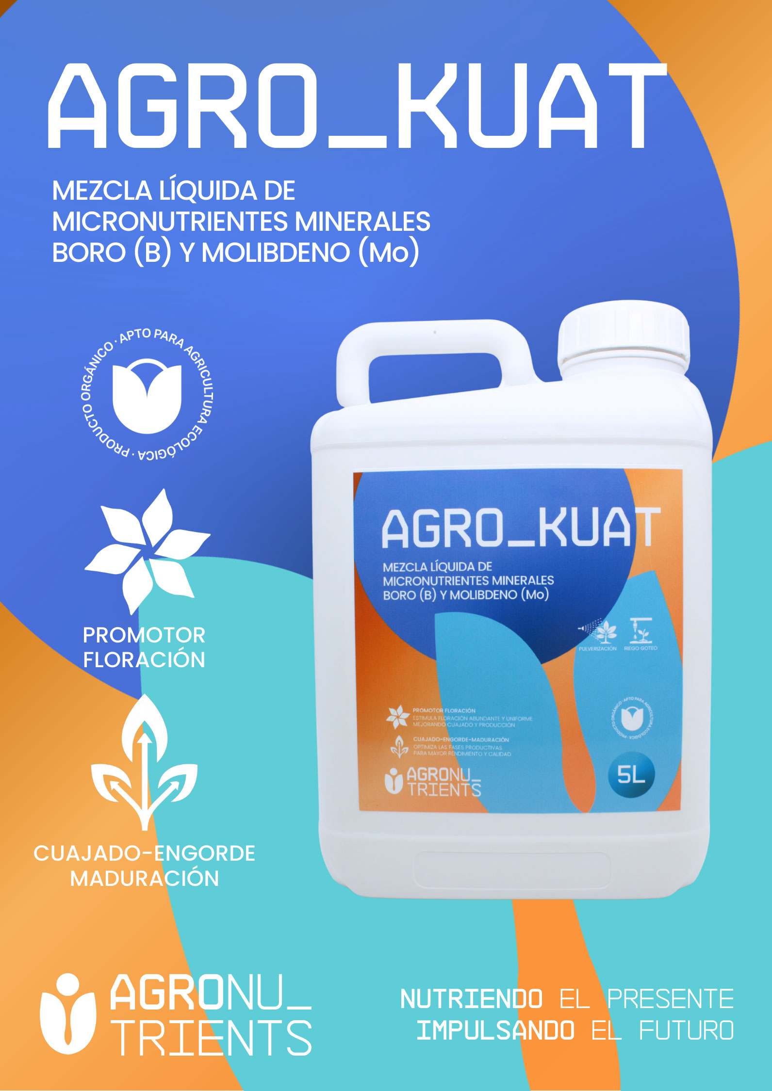 Agro Kuat es un corrector de carencias especializado y un potente promotor fisiológico diseñado para optimizar los procesos de floración y cuajado de los frutos. Su avanzada formulación, que combina ácidos grasos con un complejo enzimático, asegura una nutrición equilibrada de boro y molibdeno, favoreciendo la salud del cultivo incluso en las condiciones climatológicas más exigentes.