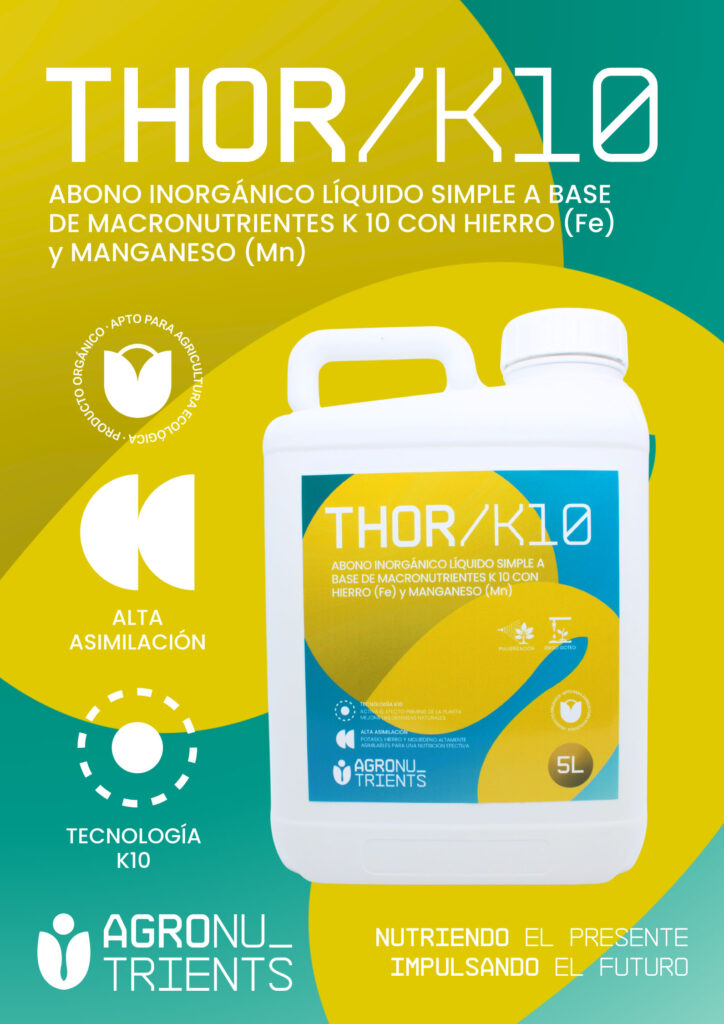 Thor-K10 es un abono líquido inorgánico avanzado de alta asimilación, formulado con potasio y microelementos esenciales como hierro y manganeso. Gracias a su exclusiva tecnología enzimática K10, esta solución actúa reforzando y activando las resistencias biológicas de la planta, promoviendo un estado de vigor fisiológico que permite al cultivo mantener su salud e integridad de forma natural.